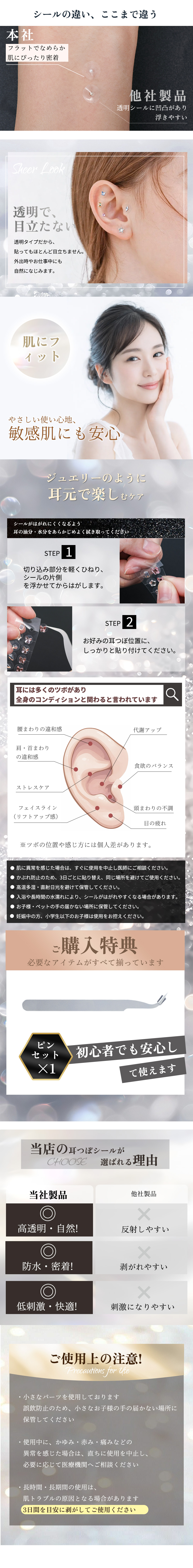 透明感のあるシールを採用し、肌になじみやすく目立ちにくい仕上がり。近くで見ても主張しすぎず、耳元に自然にフィットします。仕事中や外出時でも気兼ねなく使えるため、周囲の目を気にせず続けやすいのが特長です。