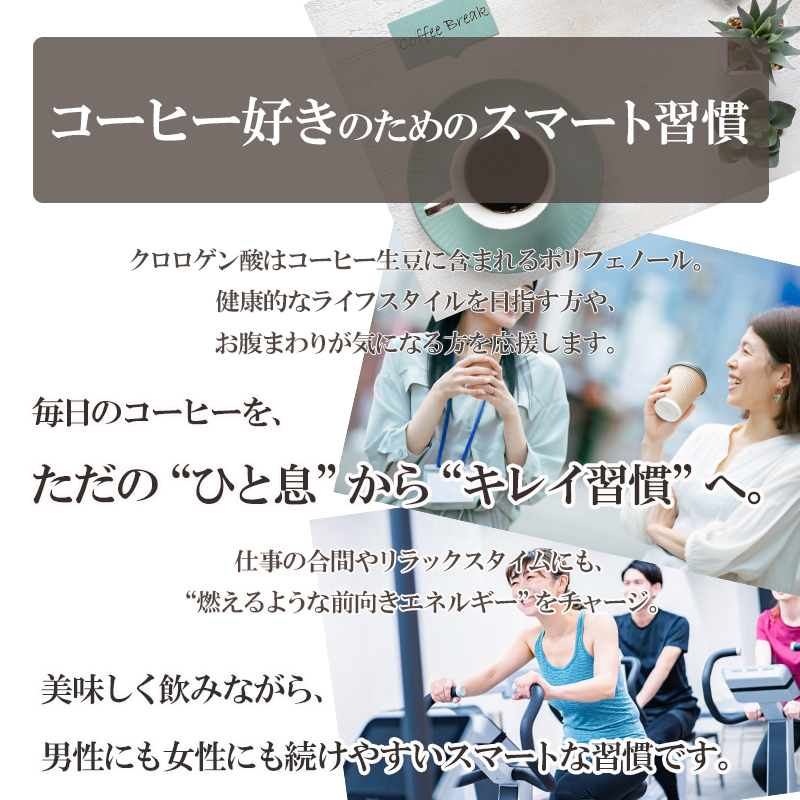 コーヒーのダイエット成分「クロロゲン酸」が1杯当たり408mg含有&送料無料!売れ行き好調の特保のコーヒーは1本(185ml)中に270mgのクロロゲン酸が含まれています。この「クロロゲン酸コーヒー」のパウダー2.5gを冷水185mlに溶かせば、408mgのクロロゲン酸を摂る事ができます。クロロゲン酸は、焙煎すると焼失してしまう為、コーヒーの生豆の濃縮エキスを、クロロゲン酸が多い焙煎したコーヒーのパウダーにブレンドしました。毎日のコーヒーで、是非ダイエットに取り組んでください。[ジップパック 50g ] <原材料産地>コーヒー(中国)/クロロゲン酸濃縮パウダー(インド)/香料(日本) 原産国:日本