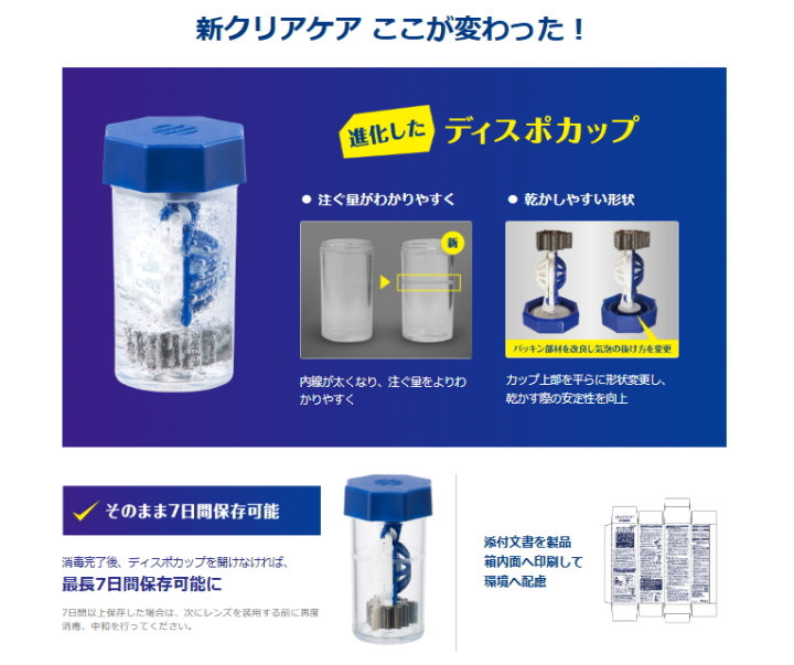 「クリアケア」は、泡の力でレンズ汚れを落とす過酸化水素タイプのソフトコンタクトレンズ消毒剤です。