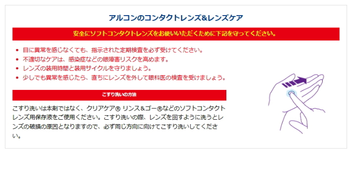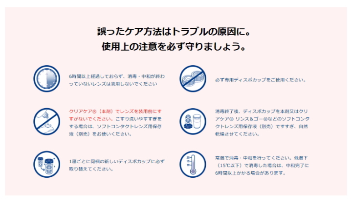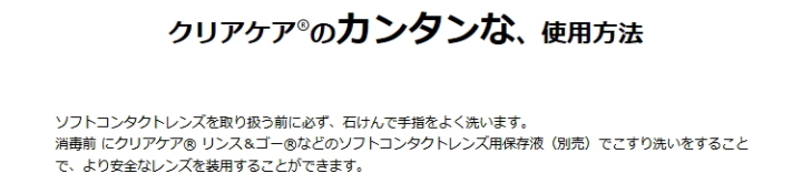 ●クリアケア で装用前のレンズをすすがないでください。こすり洗いやすすぎをする場合はソフトコンタクトレンズ用保存液(別売)をお使いください。