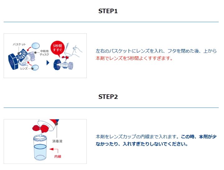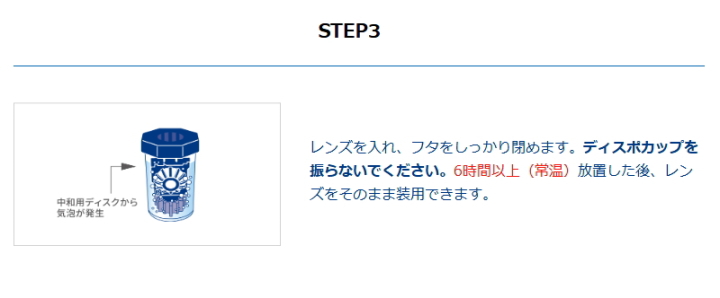 ●消毒後、7日間以上保存、もしくは途中でフタを開封した場合は、再び消毒・中和をおこなってからレンズを装用してください。
