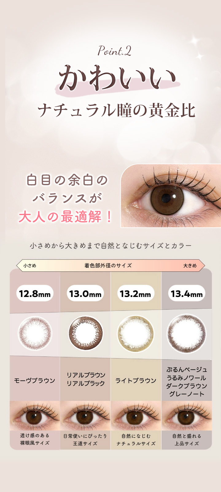 なりたい瞳の大きさで選べる"4タイプの着色直径"