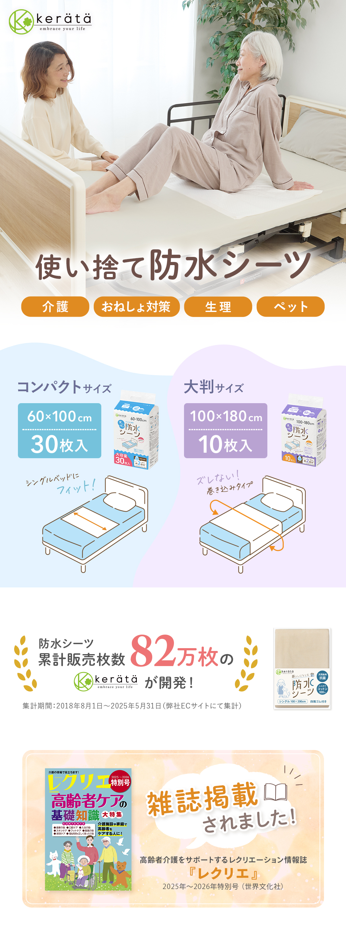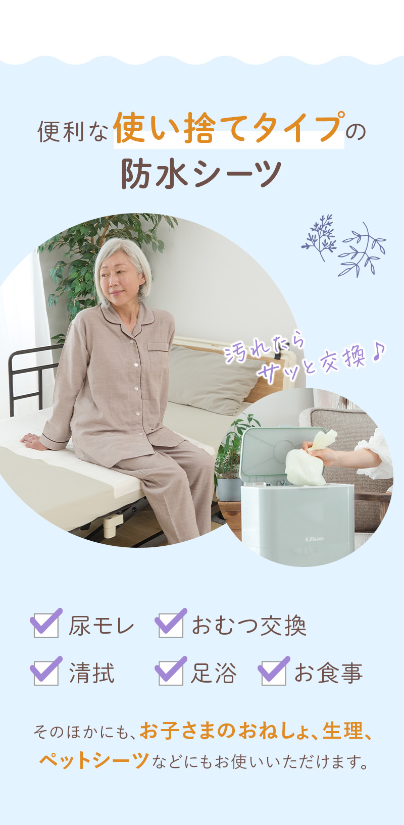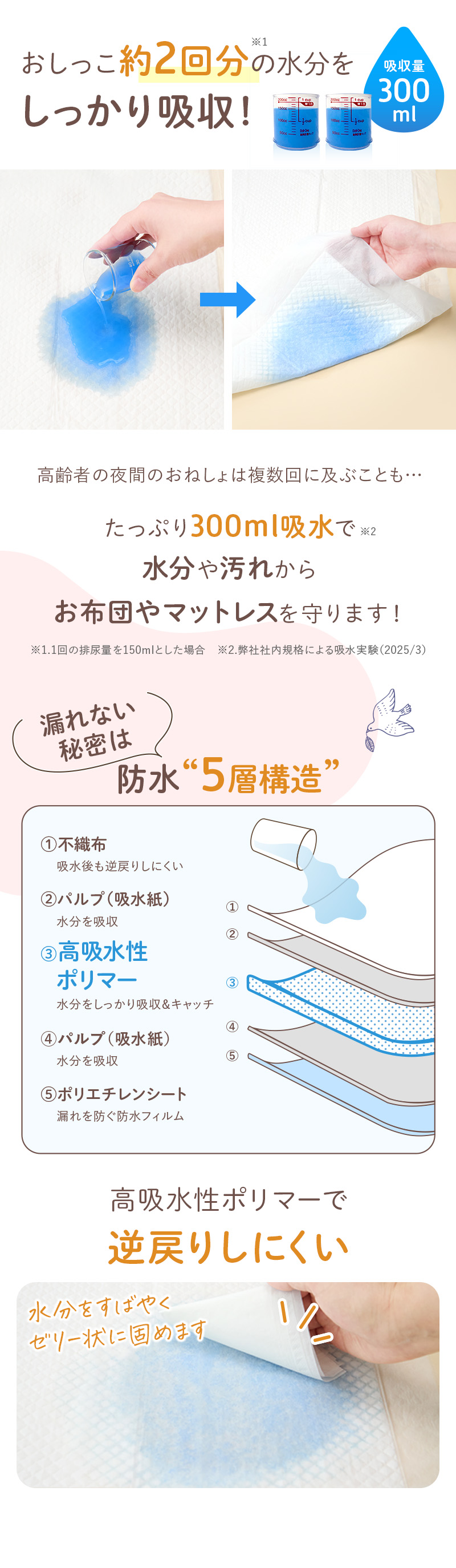 汚れたらサッと交換!失禁時やおむつ交換の漏れなど、汚れや臭いなどの衛生面が気になる場合もお洗濯不要で丸めて捨てるだけの使い捨て介護用防水シーツ。足浴や清拭やお食事などのベッドの上で行う介護のほか、赤ちゃんや子供のおねしょシーツ、生理時、猫や犬用のペットシーツ、車やソファのポイント使い、旅行先や防災アイテムにも♪5層防水で大人(高齢者)のおしっこ2回分(300ml)をしっかり吸収!おむつなどにも使われる高吸水性のポリマーが水分をしっかり吸収&キャッチして、すばやくゼリー状に固め逆戻りさせずお布団やマットレスを水分や汚れから守ります。