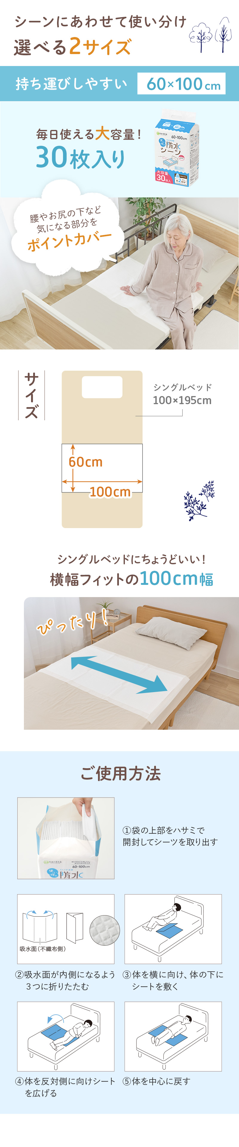 [60×100cm]は大容量30枚入りで横幅がシングルベッドにちょうどいい100cm。腰やお尻の下などの気になる部分をポイントカバーできるコンパクトタイプ。