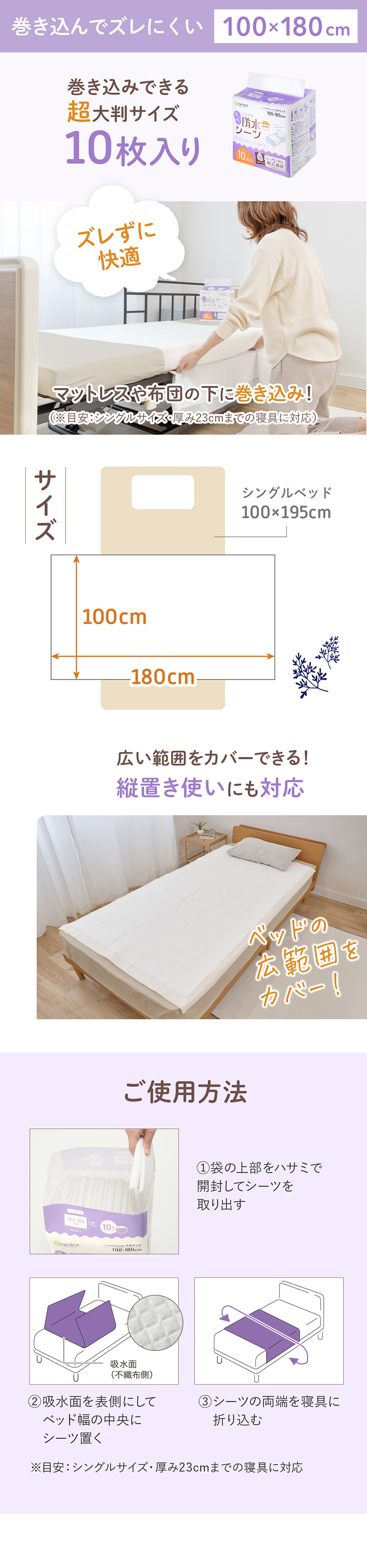 [100×180cm]マットレスや敷布団に巻き込みやすくズレにくい超大判なロングサイズの10枚入り。ベッドに縦置きすれば広範囲をカバー。