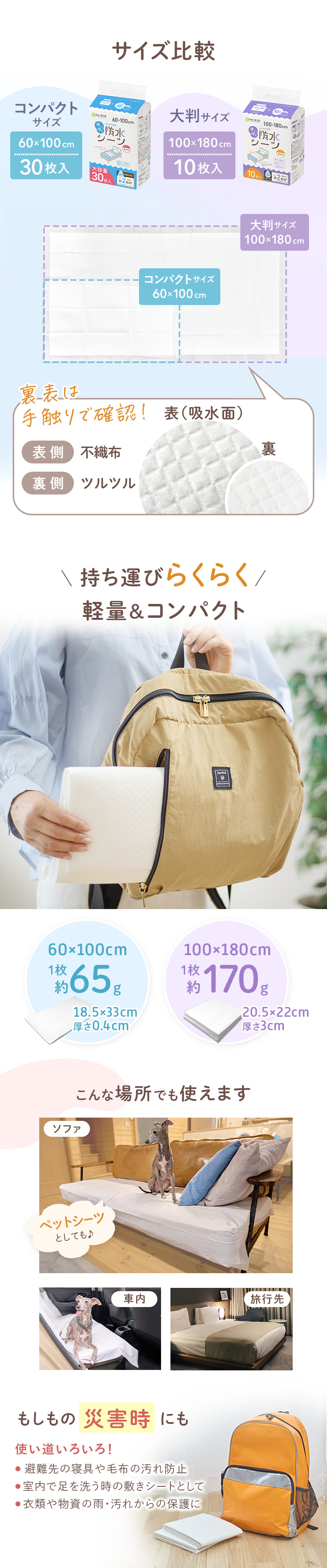 【サイズ】60×100cm(30枚入り)、100×180cm(10枚入り)【素材】高分子吸収材、綿状パルプ、パルプ、ポリエチレンシート、不織布(ポリエステル、ポリプロピレン)【企画・監修】日本【MADE IN CHINA】