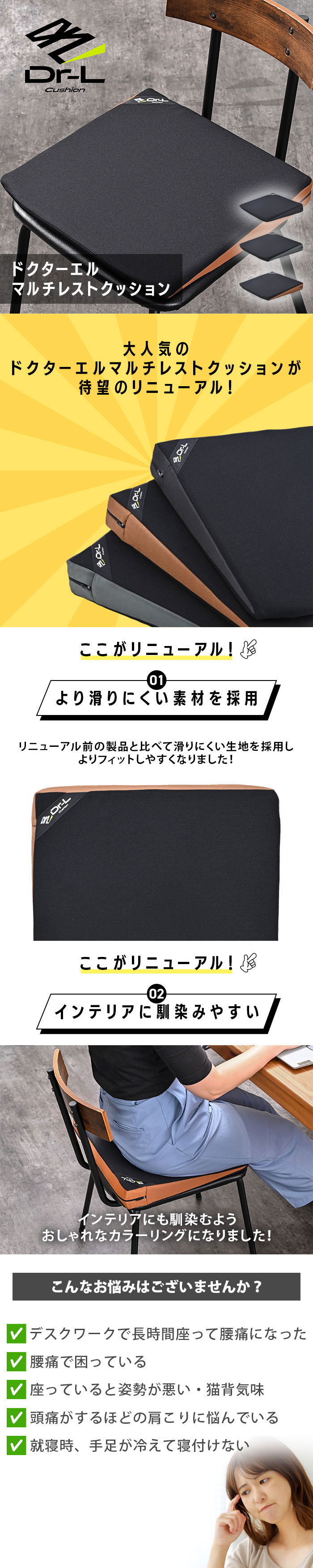 マルチレストクッション ドクターエル クッション 座布団 背もたれクッション 椅子用クッション 腰痛 腰痛対策 腰痛予防 骨盤ケア 骨盤サポート 美姿勢 正しい姿勢 オフィス デスクワーク 在宅ワーク オフィスワーク リモートワーク パソコン業務 長時間 座り仕事 姿勢悩み 冷え性 シート 車 椅子 長距離運転 運転 肩こり 猫背 ドライブ