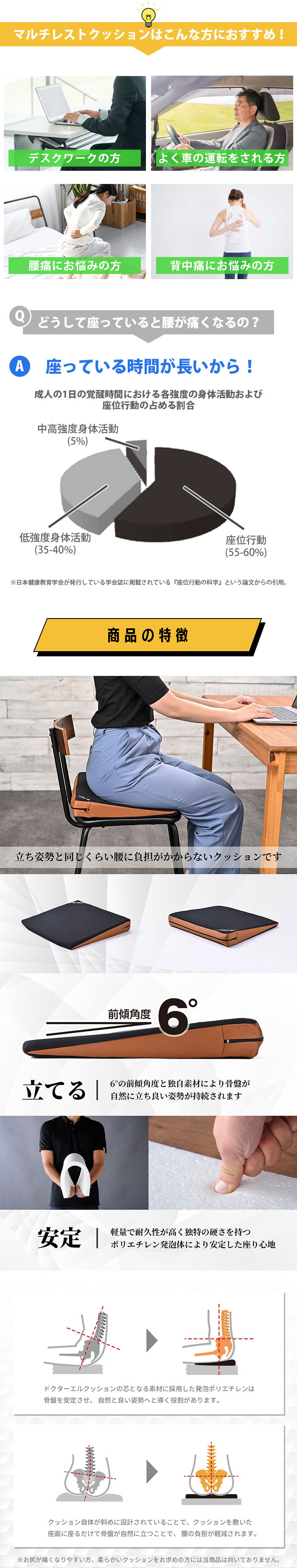 そこで座っている状態で立っている時と同じ背骨の状態に近づけるために開発されたのがこの傾斜角度を持つクッションです。