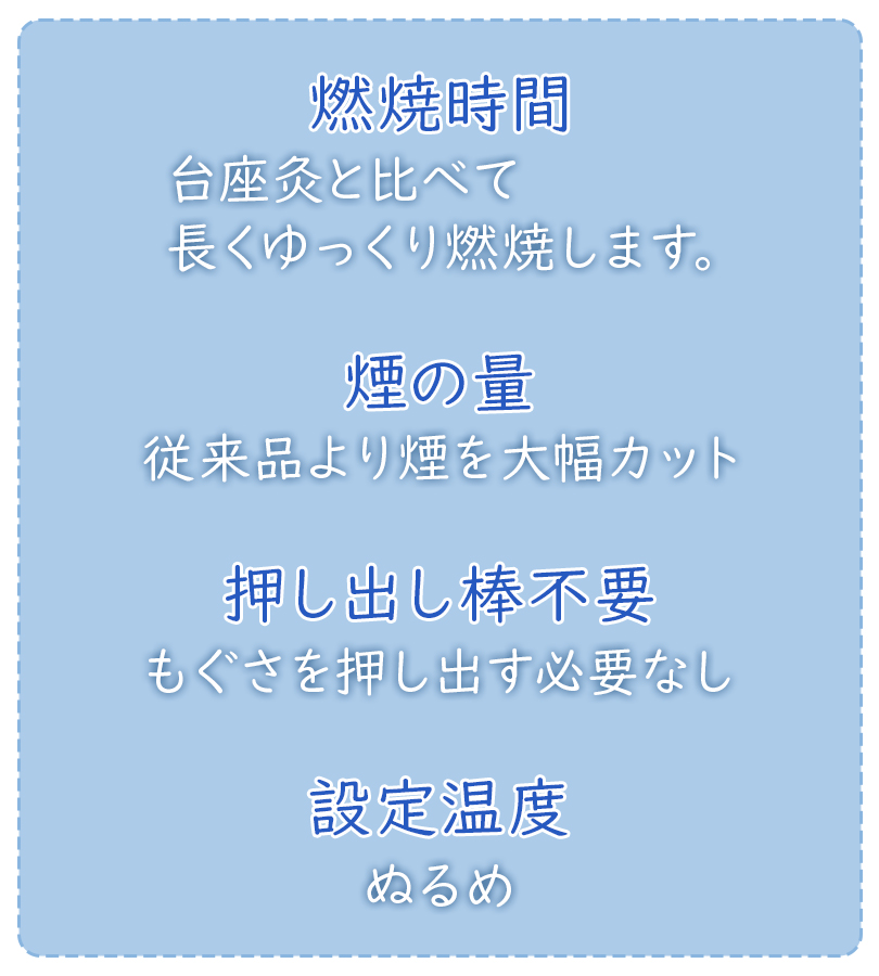 ぬるめでじっくりお灸の暖かさを感じられる