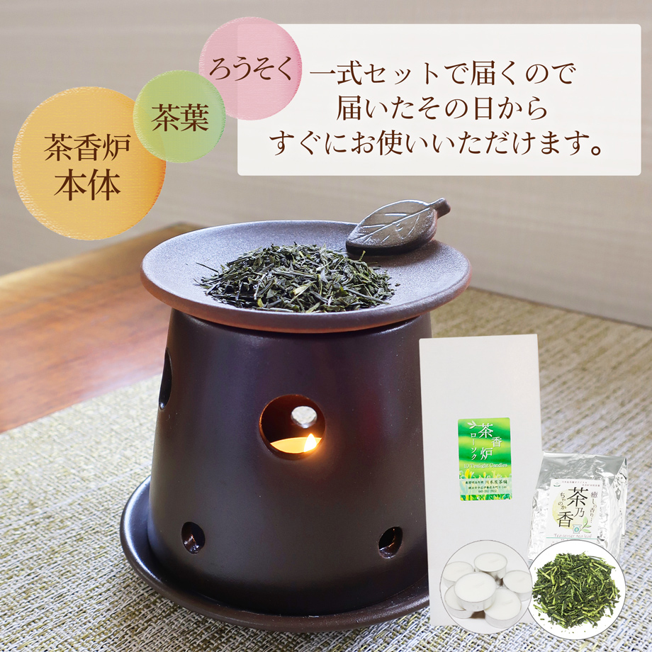 茶香炉に興味をお持ちの方に、すぐに香りをお楽しみいただける茶葉とローソク付セットです。