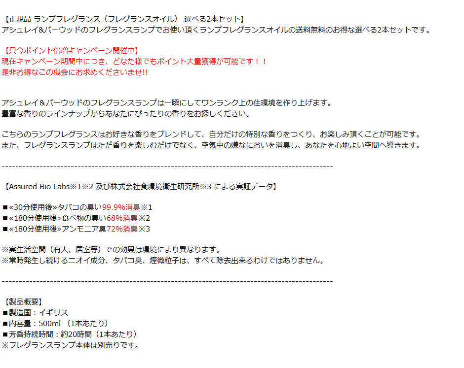 アシュレイ&バーウッドのフレグランスランプでお使い頂くランプフレグランスオイルのお得な選べる2本セットです。
