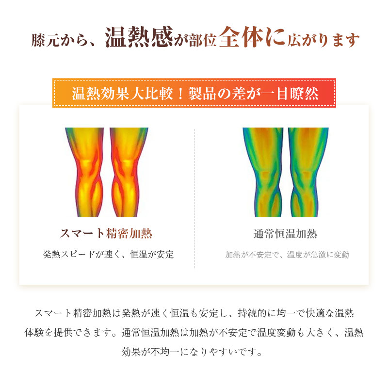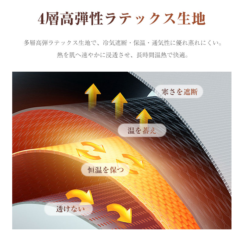 低温やけを防ぐ知能温度コントロール技術を搭載。3段階の温度調節が可能で、発熱速度が速く、設定温度を安定して維持します。従来品のように温度が不安定になることはありません。熱は4層構造の高弾力潜水生地により効率的に保持・伝導され、表層の防寒、中層の蓄熱、裏層の持続的な発熱、そして肌触りのよい最下層による熱浸透効果を通じて、深部までじんわりと温まります。