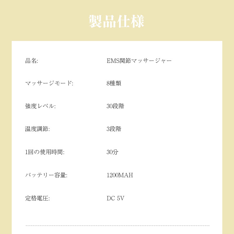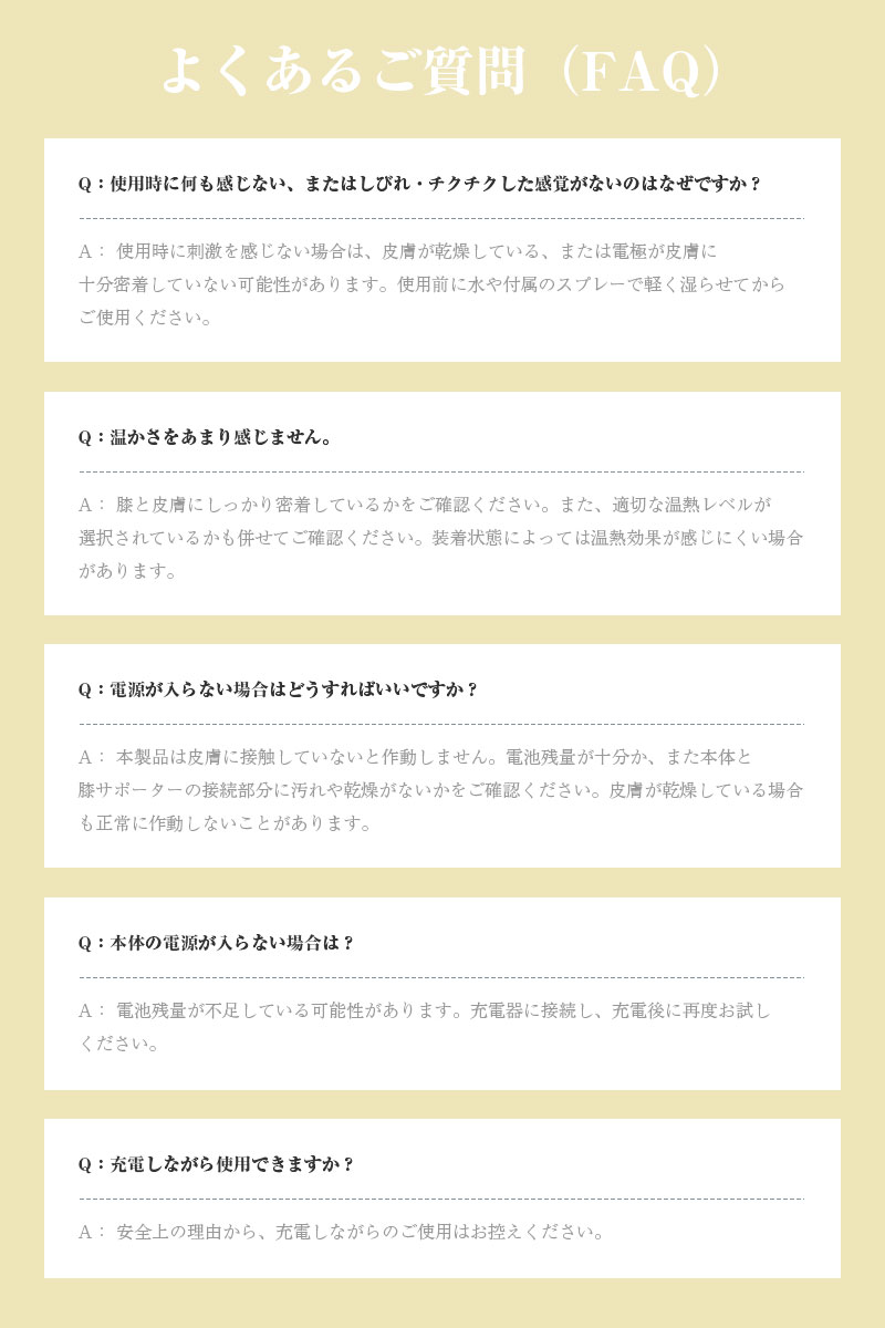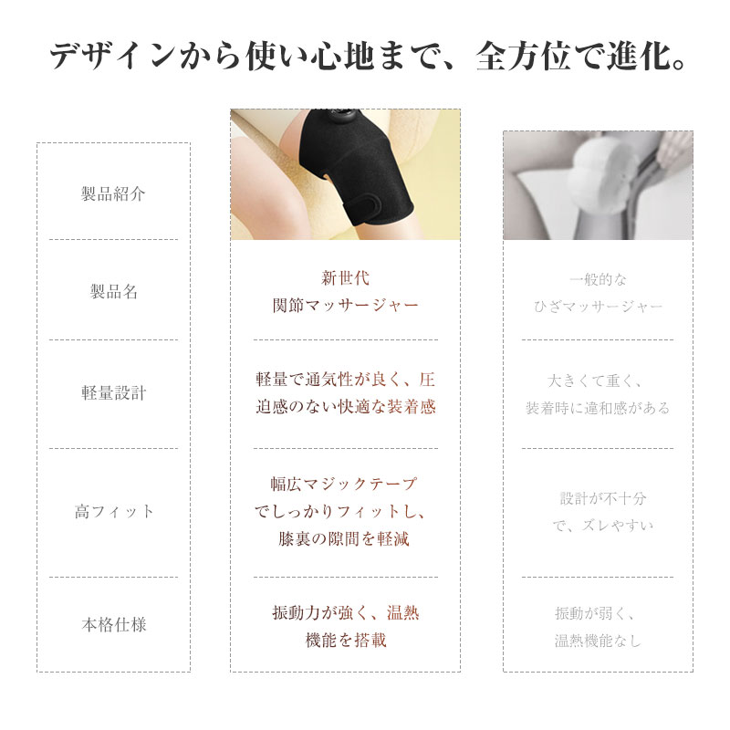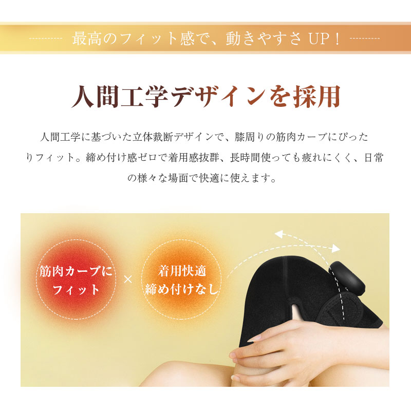 日々の歩行や運動で負担がかかる膝と肘。従来のサポーターでは物足りない方へ。最新EMS技術とケア分野のノウハウを結集した、本格的なマッサージと温熱機能を兼ね備えた次世代型関節ケアサポーターです。日常的な疲労緩和から、本格的なケアを必要とする方まで、快適で効果的な使用を実現します。更に、軽量で快適な装着感は、家事やオフィスワーク、リラックスタイムなど、日常のさまざまなシーンに自然に溶け込み、膝のつらいと感じる瞬間を、癒しと快適さに変えます。ご自身の健康投資として、またご家族への気配りとして、最適な選択肢となるでしょう。