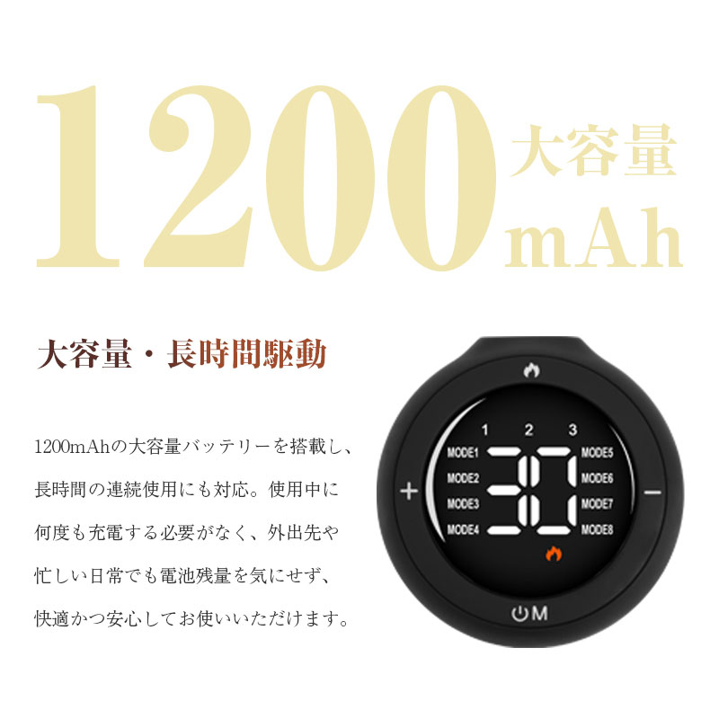 内蔵バッテリーは1200mAhと大容量で、長時間の使用を可能にします。