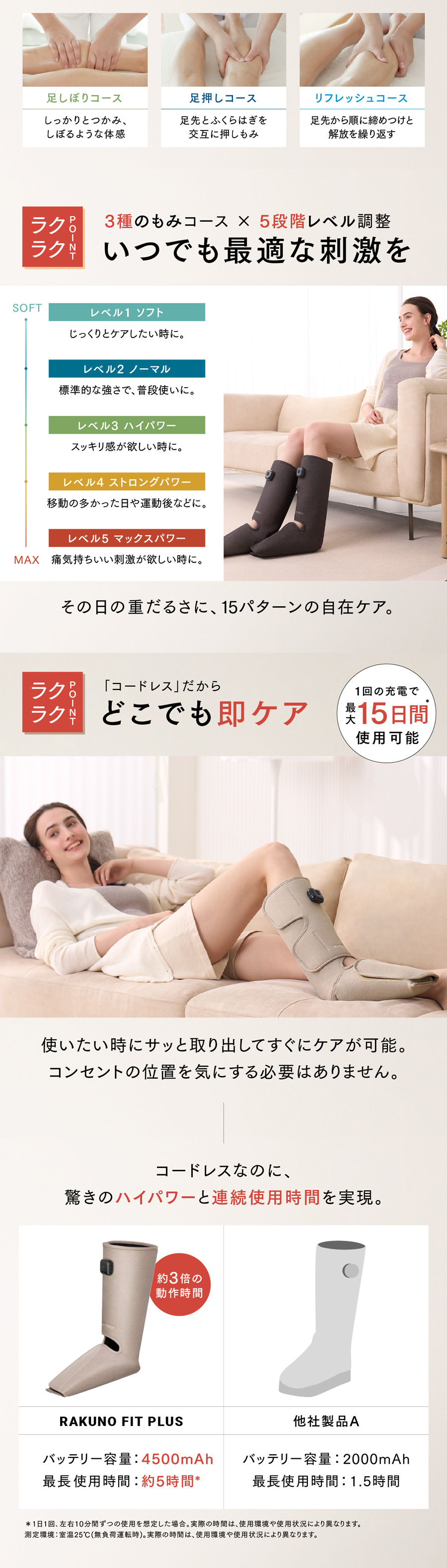 【15パターンの刺激】 3種の揉みコース×5段階レベル調整あり。