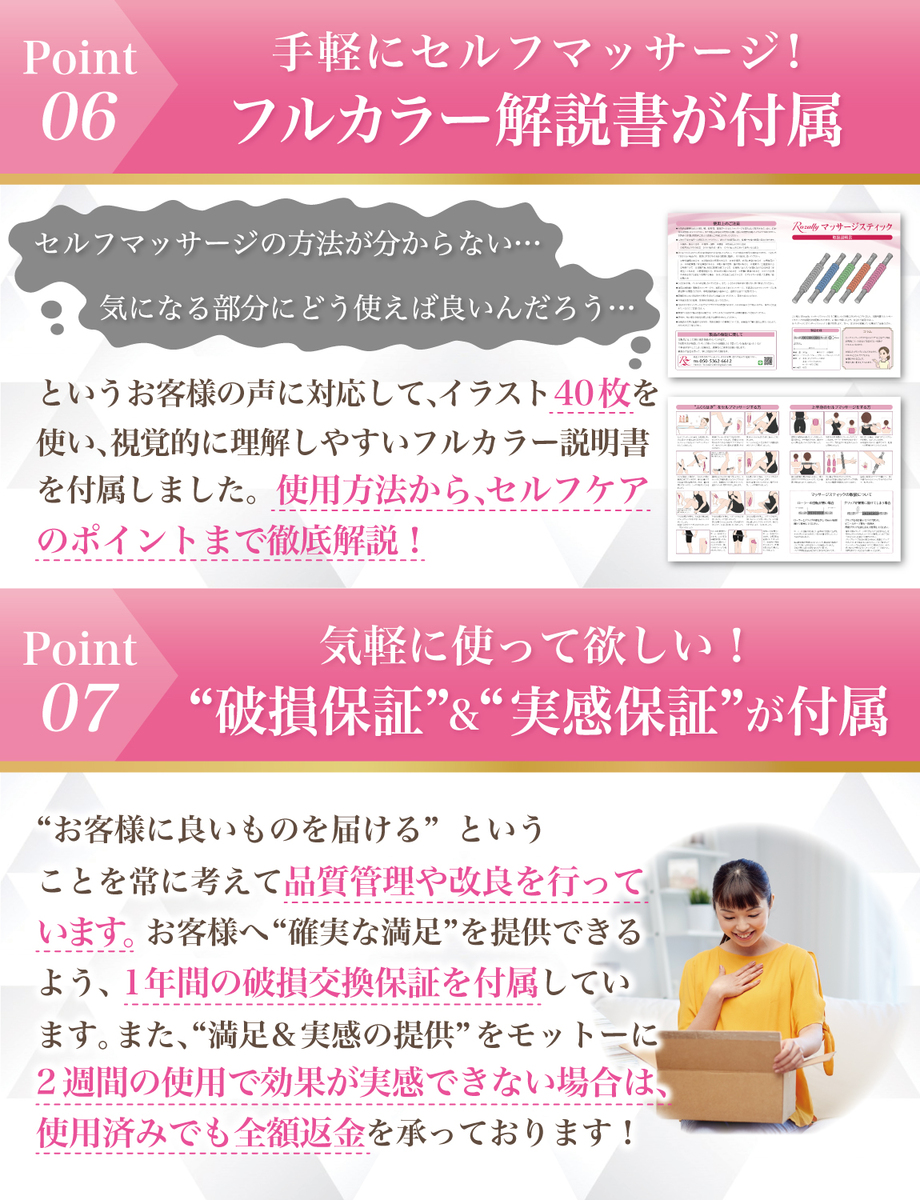 【フルカラー説明書が付属!】 本製品には自宅のリラックスタイムに全身ケアして頂けるよう、「首」「肩」「背中」「ふくらはぎ」「腰」「太もも」など、各パーツへの使用方法の解説はもちろん” 首コリ ” むくみとり ” 筋膜 リリース ” ストレッチ ”など様々な角度から使用方法を丁寧に解説させて頂きました。( リンパ が密集する場所はデリケートになっていますので優しく使用してください。)【運動後のケアに!】 最近のトレンドでは「 美脚 を目指すために “脚痩せ” や “足痩せ” 」という目的でジムに通って ダイエット や 筋トレ を行う女性が増えています。筋膜リリース(筋膜ケア)は運動後のストレッチ代わりに注目を集めており、弊社のマッサージスティックも、ストレッチ代わりとして使用されるお客様が増えています。それぞれの用途に対して説明書ではイラストを存分に使って使用説明させて頂いております。