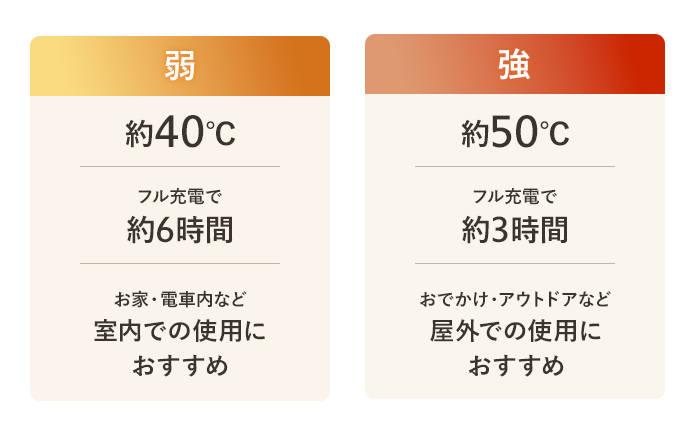 温度設定は弱と強の2段階で調節が可能です。気温やシチュエーションに合わせて使い分けることができます。
