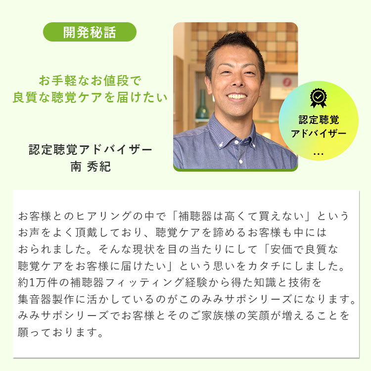「お客様とのヒアリングの中で「補聴器は高くて買えない」というお声をよく頂戴しており、聴覚ケアを諦めるお客様も中にはおられました。そんな現状を目の当たりにして「安価で良質な聴覚ケアをお客様に届けたい」という思いをカタチにしました。約1万件の補聴器フィッティング経験から得た知識と技術を集音器製作に活かしているのがこのみみサポシリーズになります。みみサポシリーズでお客様とそのご家族様の笑顔が増えることを願っております。」