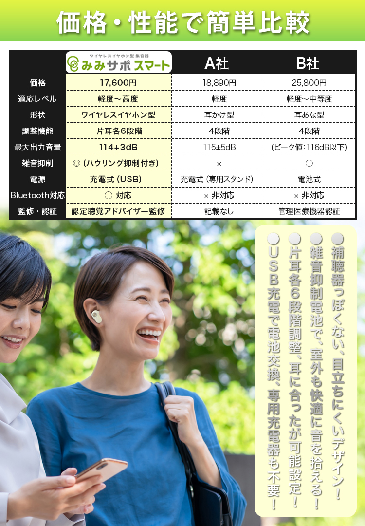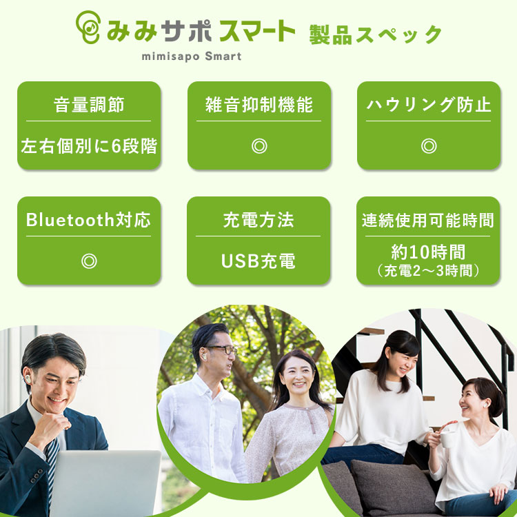 みみサポスマート\認定補聴器技能者監修/あなたの「聴こえ」をサポートする、目立たないワイヤレスイヤホン型集音器。毎日の会話がもっと聴こえる、もっと弾む!